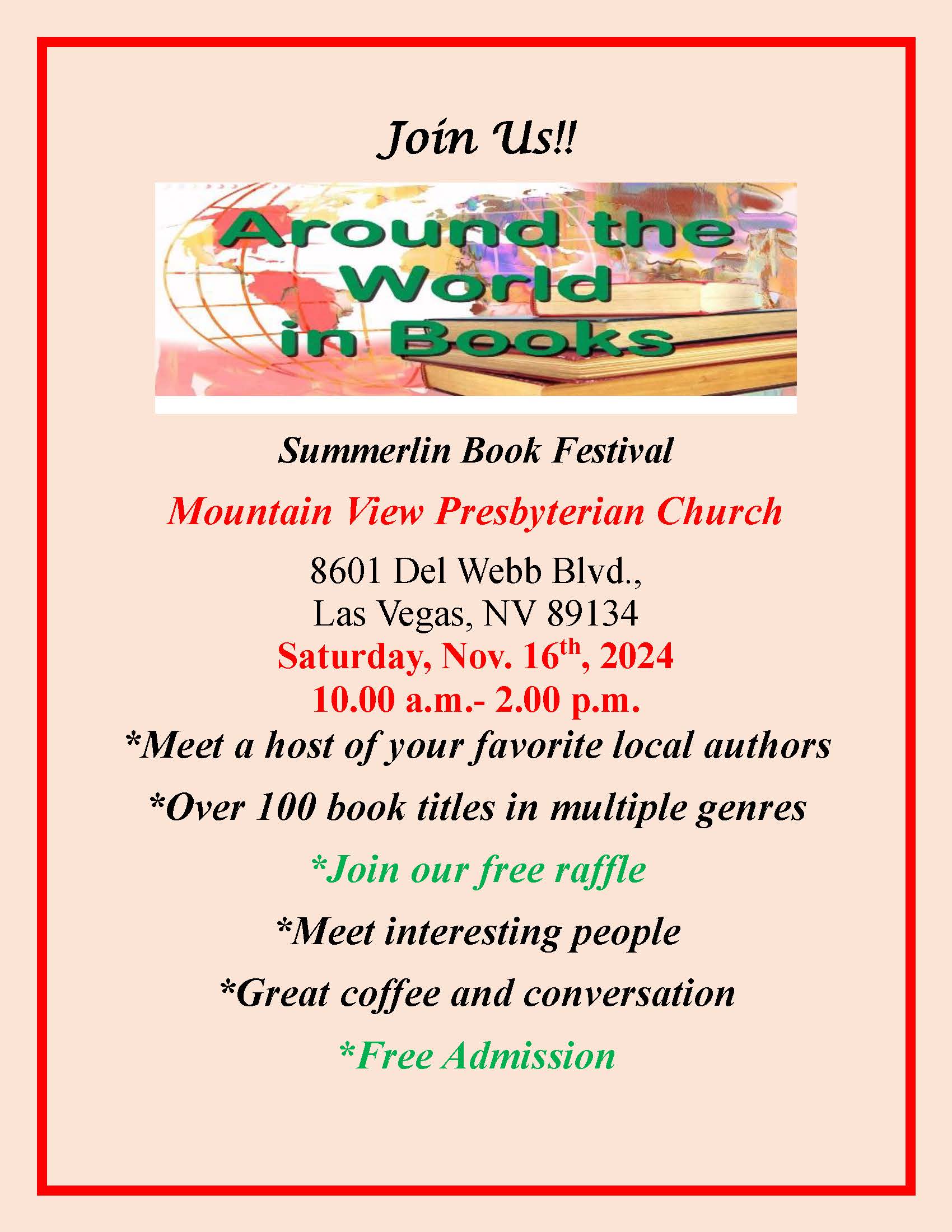Many thanks to Dianne Romano of the Sun City Summerlin Reader’s Book Club, Maxine Muccigrosso of the Sun City Summerlin Writers Workshop, and Shane Jensen of the Mountain View Presbyterian Church in Sun City for spearheading this event and making it happen…..and to all the participating authors.