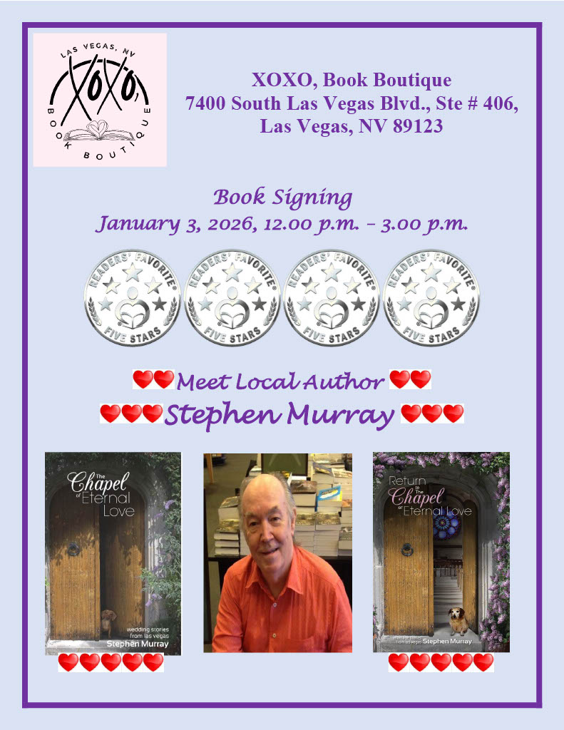XOXO, Book Boutique 7400 Las Vegas Blvd. S., #46, Las Vegas, NV, United StatesI am excited that my first signing of the new year will be my first at this particular venue. XOXO, Book Boutique only sells romance-oriented books, therefore, I will only be signing copies of The Chapel of Eternal Love: Wedding…